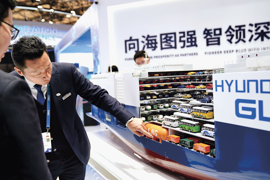 >>On December 2, 2025, at the Marintec China, an exhibitor introduces the interior of a car carrier. Credit: Zhang Jiansong, Xinhua News Agency.