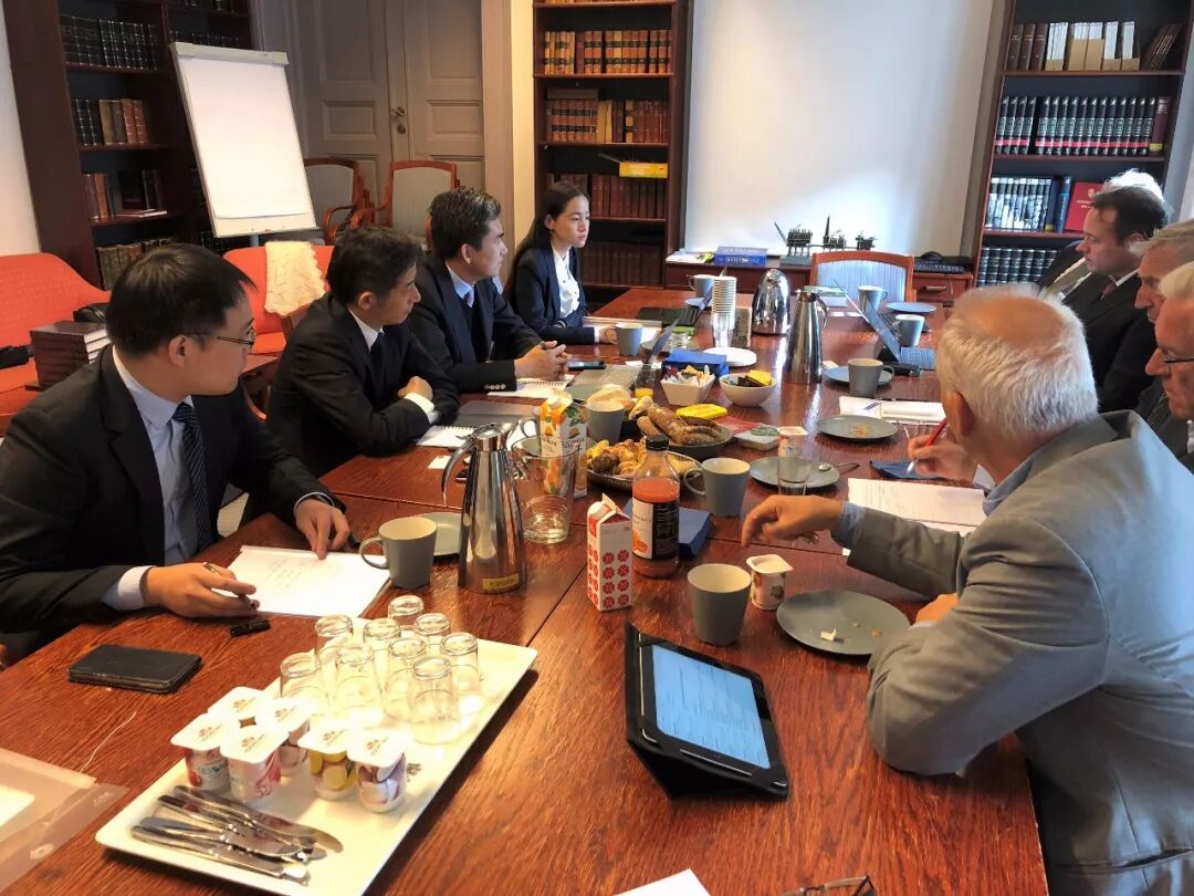 8月27日,代表团首先对挪威海商法协会进行了正式的访问活动。会议在NIFS石油与能源法会议室进行。挪方参与会议的专家主要包括挪威海商法协会主席Andreas Meidell博士,协会理事、NIFS教授Trond Solvang,协会前任主席、NIFS教授Erik Røsæg,名誉教授Thor Falkanger,以及北欧保赔协会(Nordisk Defence Club)前任主席Georg Scheel先生。Meidell先生首先代表挪威海商法协会欢迎中方代表团的到访,并就挪威海商法协会的性质,及其在促进挪威海商事法律和航运与离岸能源行业发展中起到的作用做了介绍。魏东司长对挪威海商法协会和NIFS对我方代表团此次访问的盛情接待表示感谢,并对当前我国《海商法》修改的背景和近年来我国航运实践的发展做了说明。Røsæg教授主持会议,他首先对国际海事委员会《关于外国船舶司法出售及其承认的国际公约草案》(北京草案)的最新进展做了介绍。借此,他进一步详细说明了挪威与欧盟立法之间在海商事法律方面的相互关系。初北平教授向挪方专家逐章介绍了我国《海商法》修改的内容要点,并就我方对《海商法》修改中所关心的重要内容做了概要性的介绍。随后,会议进入实质性研讨环节。挪方专家主要就挪威法律制度下对内河/沿海运输的法律规制及行业现状进行了详细的介绍和说明。魏东司长与马琳处长分别就挪威法律中对沿海内河运输的调整方式以及相应的保险安排和保险市场征求了挪方专家的意见。会中的休息环节双方进行了简短的礼物交换。